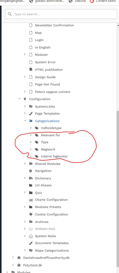 Den ligger i bunden under "Forside". Herunder følger de kategorier, hvor vi plejer at tilføje nøgleord.
