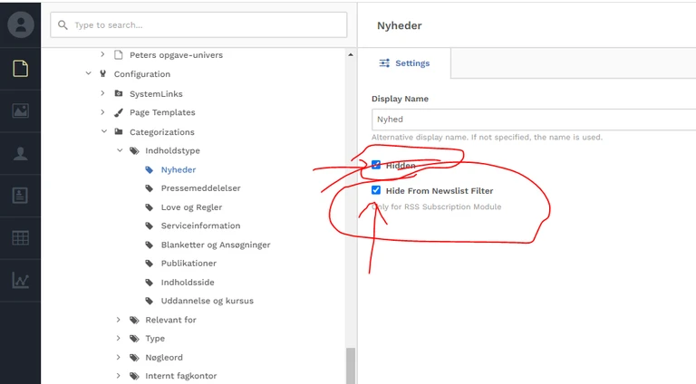For hvert nøgleord og kategori skal BEGGE felter krydses af, så ordene bliver skjult på frontenden.