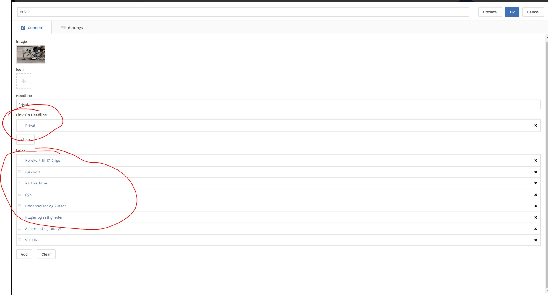 1. Det kan hurtigt blive uoverskueligt at se forskel mellem link på headline og link på de underordnede links (se billede herunder).