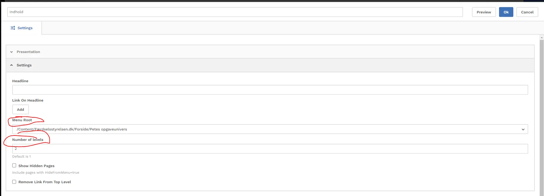 Under niveau vælger I, om der fx kun skal vises undermenuer. Det er dette, som oftest er anvendt på hoved-kategori-sider.